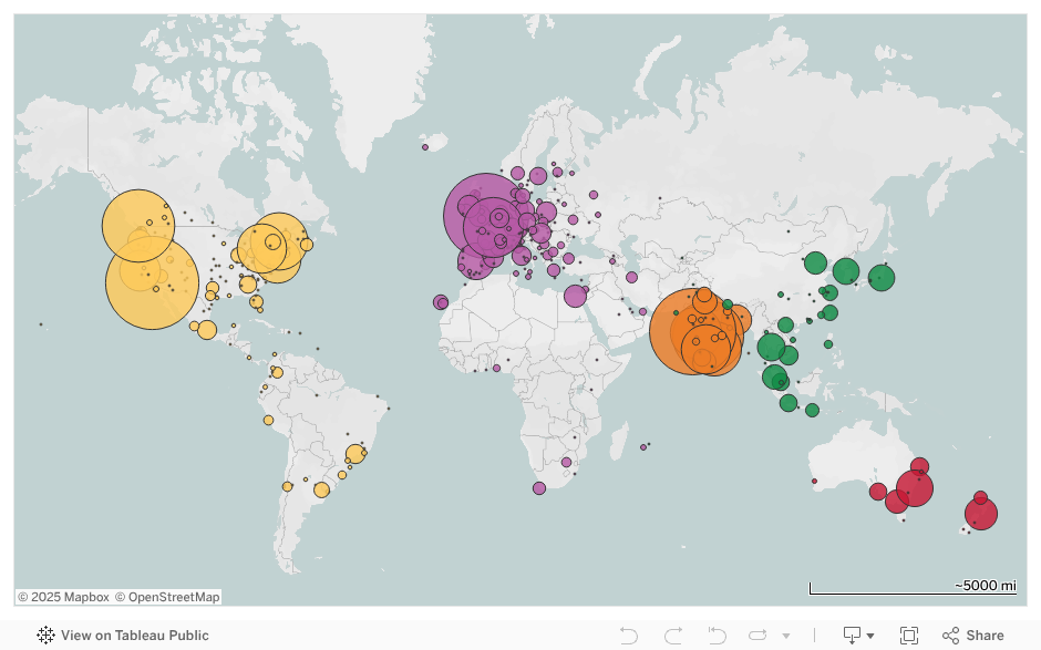 This map shows over 400 cities covered by the Visual Effects & Animation World Atlas. As with all of the maps and charts in the Atlas, it does not capture every single industry professional or company worldwide. Instead, it shows the 120,000+ professionals and 2,500 companies in the Atlas dataset. You can zoom and pan across the map, and move your mouse cursor over each city to see the number of records (people) identified by our study.